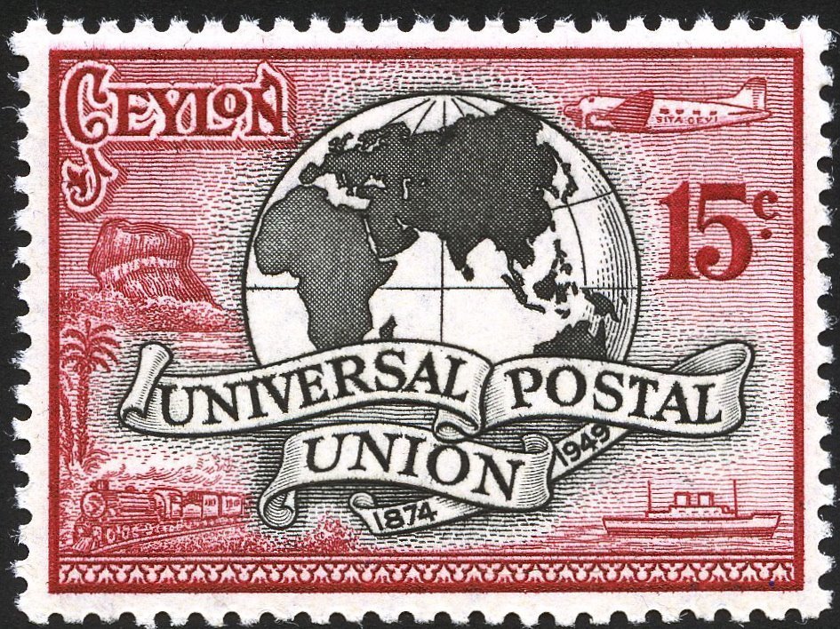 Commemorative 1949 postage stamp from Ceylon celebrating the 75th anniversary of the Universal Postal Union, depicting a globe, various modes of transport and the historic Sigiriya rock fortress.